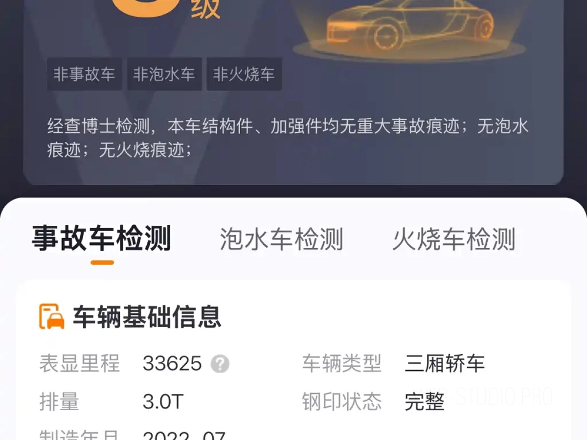 На странице представлены основные характеристики автомобиля BMW M3 2023, включая двигатель, пробег, состояние и комплектацию.